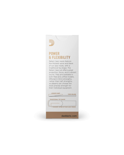 Caña Saxofon Tenor D'addario Select Jazz Unfiled 2S. El corte de las cañas para saxofon D'addario Select Jazz se caracteriza por una caña fuerte, bien definida y con un largo biselado que nos proporciona un sonido grueso y con mucha proyección. Muy flexible con una respuesta brillante y rápida.