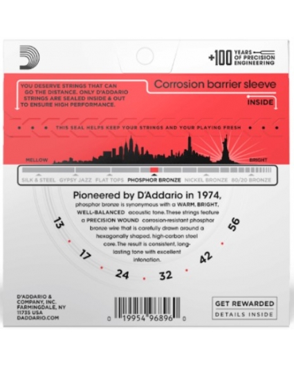 Cuerdas D'addario EJ24 Phosphor. Juegos de cuerdas Guitarra Acústica Serie EJ Phosphos Bronze Medium Gauge (013 - 017 - 024 - 032 - 042 - 056). Las cuerdas D'Addario Phosphor Bronze para guitarra acústica son reconocidas por todo el mundo por su magnífico y duradero tono. El Bronce de Fósforo fue introducido para la fabricación de cuerdas por D'Addario en 1974 y se ha hecho sinónimo de calidez, brillantez y buen equilibrado del tono acústico. Son las cuerdas de guitarra acústicamás populares de D'Addario.